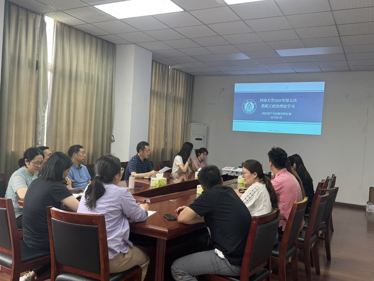 2025年5月9日,国有资产与后勤管理处在文俊楼514会议室开展了2025年第五次教职工政治理论学习,处长黄昌建主持会议。